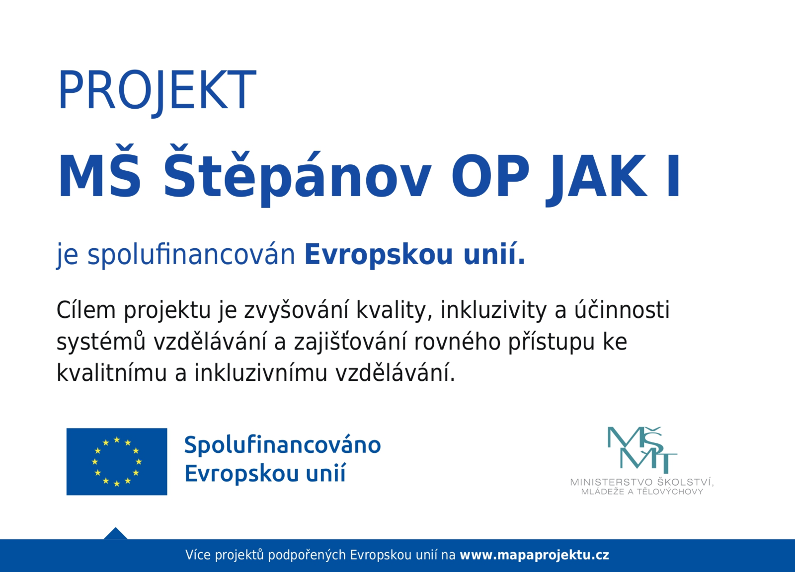 Jsme pětitřídní mateřská škola a nacházíme se ve více osídlené části Štěpánova, na sídlišti. Součástí je rozlehlá zahrada, kde má každá třída své samostatné hrací zázemí, ale také společné prostory pro setkávání a sport všech dětí.